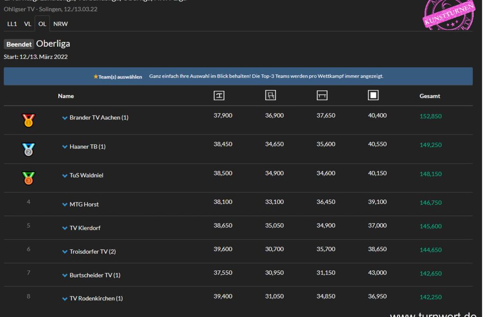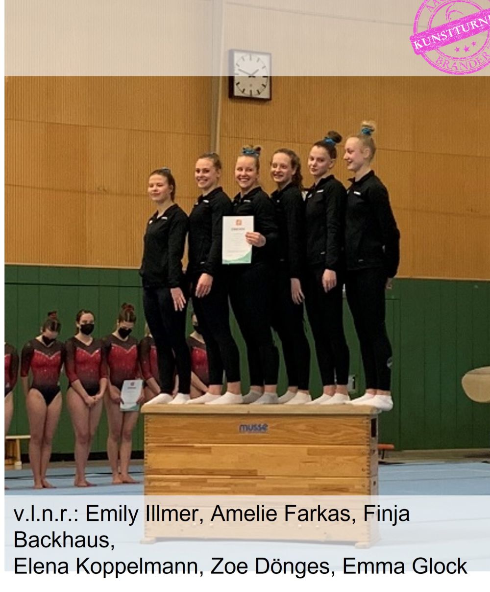 Nach zweijähriger Wettkampfpause durch die Covid-Pandemie geht es jetzt endlich wieder los; für die Brander Mädels nach dem Aufstieg 2019 nun erstmals in der Oberliga der Rheinischen Turnligen. Wieder – wie schon bei den fünf Aufstiegen zuvor – dominieren sie als Newcomer ihre Liga mit 152,85 Punkten gefolgt vom Haaner TB (149,25) und dem Tus Waldniel (148,15) auf dem Silber- bzw. Bronzerang.