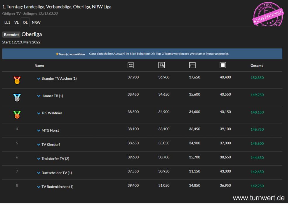 Die vollständige Ergebnistabelle mit allen Details findet sich bei TURNWERT, einer tollen App, die erstmals in der Liga eingesetzt wird und die alle Wettkampfergebnisse live ins Internet überträgt: www.turnwert.de